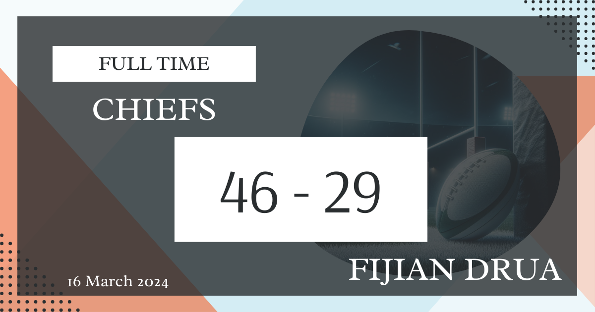2024スーパーラグビー・パシフィック第4節は3月16日、チーフスが地元ハミルトンでフィジアン・ドゥルアを迎え撃ちました。前節、クイーンズランド・レッズ戦でまさかの苦杯をなめたチーフスに対し、王者クルセイダーズを降して勢いに乗るドゥルアでしたが、試合はチーフスが地力を発揮して攻守ともに安定感を見せ、46ー29で勝利を収めました。